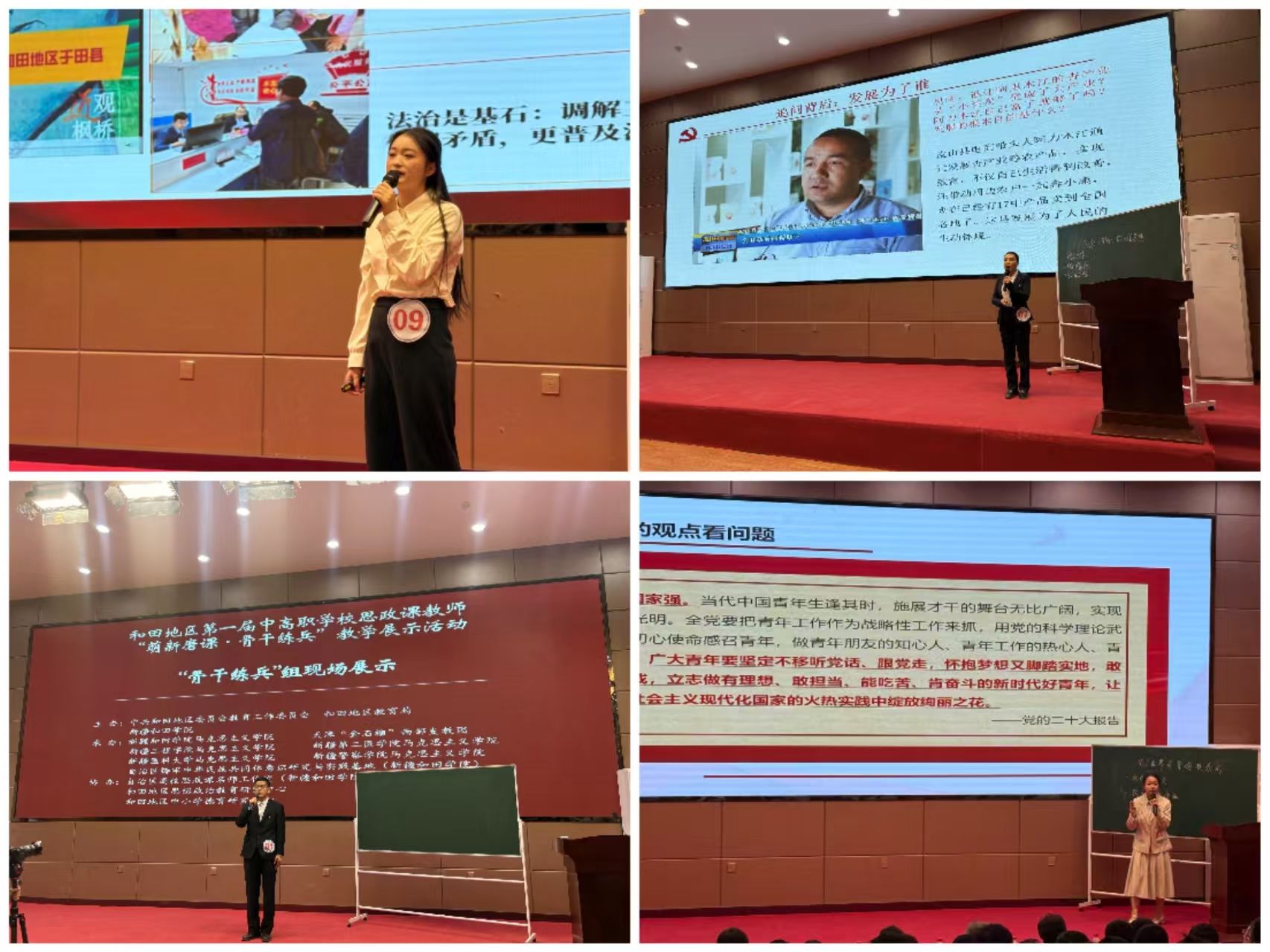 在现场展示环节,20名参赛教师通过自选课题或现场抽签确定授课内容,凭借精心的教学设计、鲜活的案例分析、多元的教学形式,对课程知识点进行深入解读与系统呈现,充分彰显了和田地区中高职院校思政课教师队伍的过硬教学水平与昂扬精神风貌。