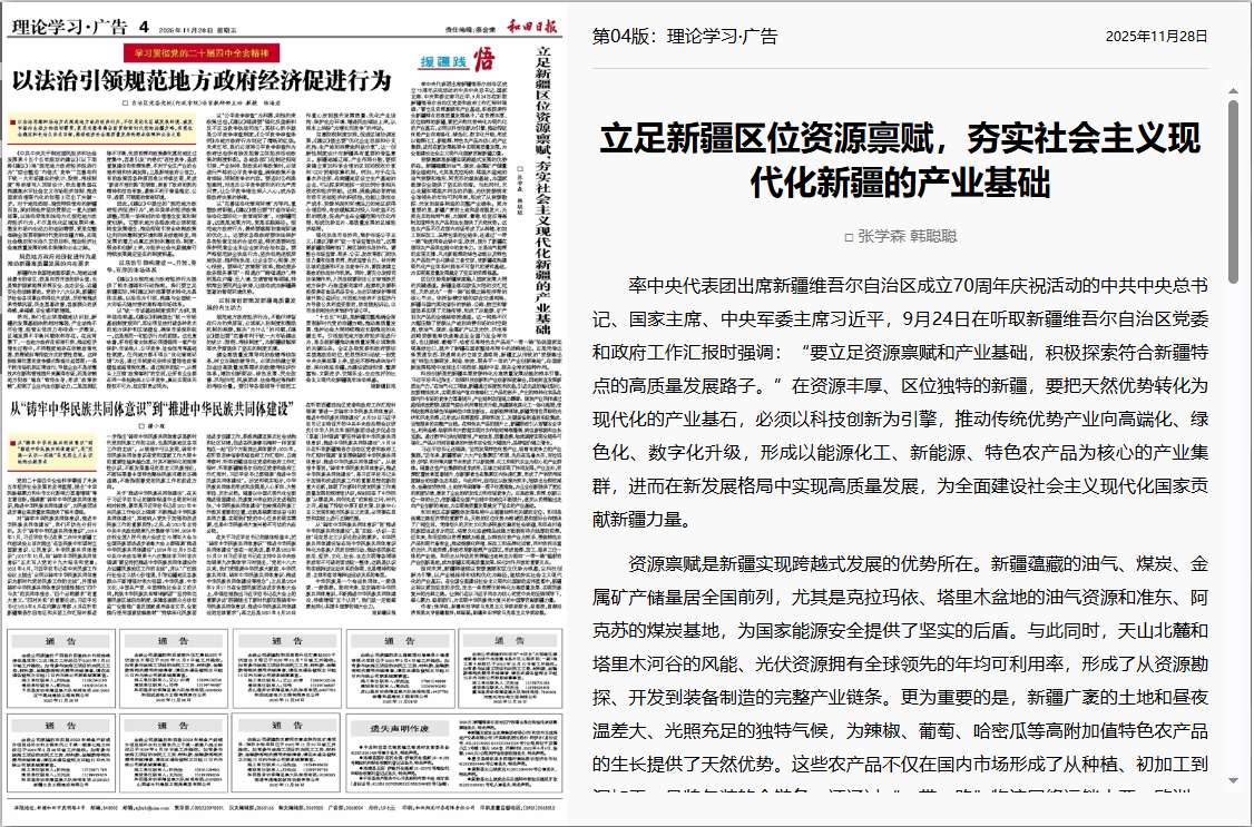 面向未来,新疆将继续以资源禀赋和区位优势为根基,以科技创新为引擎,以产业链延伸和结构优化为路径,继续夯实社会主义现代化的产业基石。在全国全面建设社会主义现代化国家的宏伟蓝图中,新疆必将以更加坚定的步伐,走出一条资源优势转化为高质量发展、实现民族复兴的光辉之路。让我们在以习近平同志为核心的党中央的坚强领导下,凝心聚力、砥砺前行,为实现中华民族伟大复兴的中国梦贡献新疆力量。